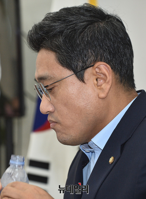 오신환 바른미래당 원내대표가 5일 오후 국회에서 혁신위원회가 개최한 '21대 총선 승리를 위한 지도부 비전검증'에서 물을 마시고 있다.