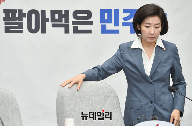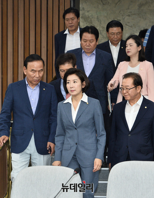 나경원 자유한국당 원내대표 및 지도부가 6일 오전 국회에서 열린 원내대책회의에 입장하고 있다.