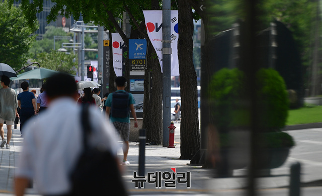 서울 중구청(구청장 서양호)이 설치한 '노 재팬' 반일 배너기가 6일 오후 서울 세종대로에 우선 설치됐다.