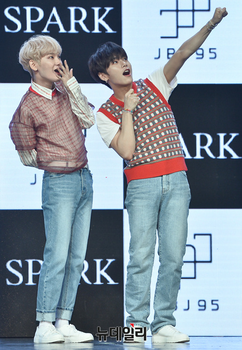 아이돌그룹 JBJ95(제이비제이 95)가 6일 오후 서울 광진구 예스24 라이브홀에서 열린 세번째 미니앨범 'SPARK(스파크)' 쇼케이스에서 포토타임을 갖고 있다.
