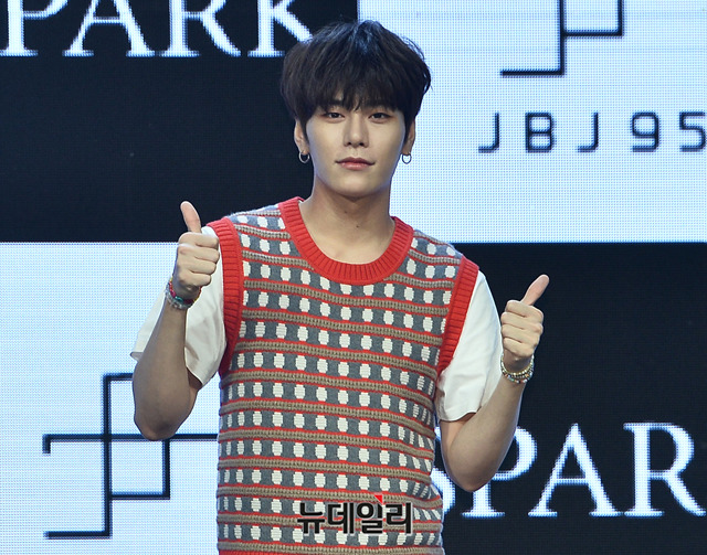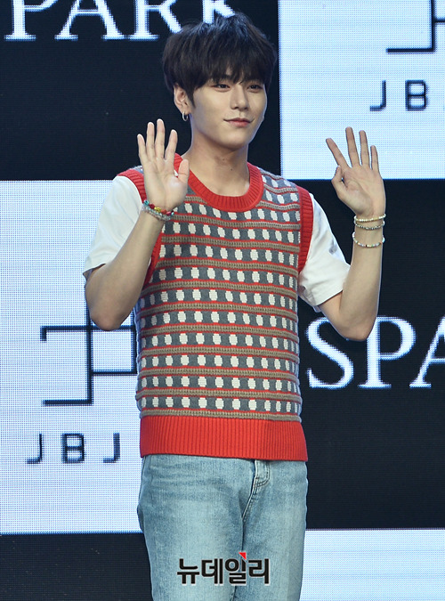 아이돌그룹 JBJ95(제이비제이 95) 상균이 6일 오후 서울 광진구 예스24 라이브홀에서 열린 세번째 미니앨범 'SPARK(스파크)' 쇼케이스에서 포토타임을 갖고 있다.