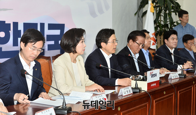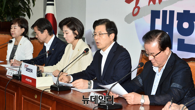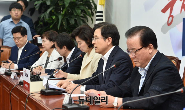 황교안 자유한국당 대표가 7일 오전 국회에서 열린 당대표 및 최고위원 중진의원·연석회의에서 모두발언을 하고 있다.