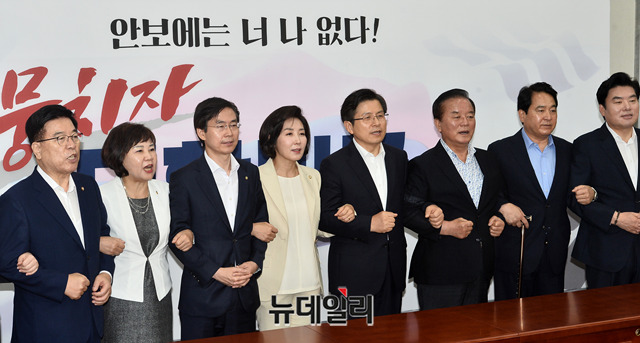 황교안 자유한국당 대표, 나경원 원내대표, 조경태 최고위원, 김순례 최고위원, 김광림 최고위원, 정갑윤 의원, 심재철 의원, 원유철 의원이 7일 오전 국회에서 열린 당대표 및 최고위원 중진의원·연석회의에 앞서 진행된 백보드 제막식 직후 구호를 외치고 있다.