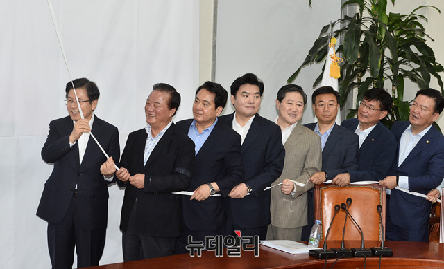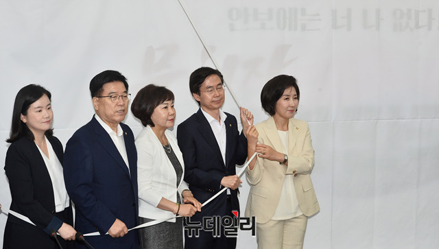 황교안 자유한국당 대표, 나경원 원내대표 및 지도부가 7일 오전 국회에서 열린 당대표 및 최고위원 중진의원·연석회의에 앞서 백보드 제막식을 하고 있다.