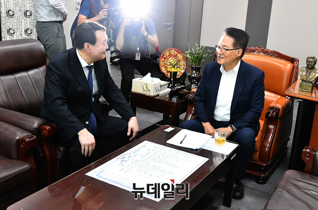 윤석열 검찰 총장이 7일 오전 국회 의원회관을 찾아 박지원 민주평화당 의원을 예방하고 환담을 나누고 있다.