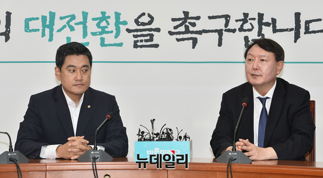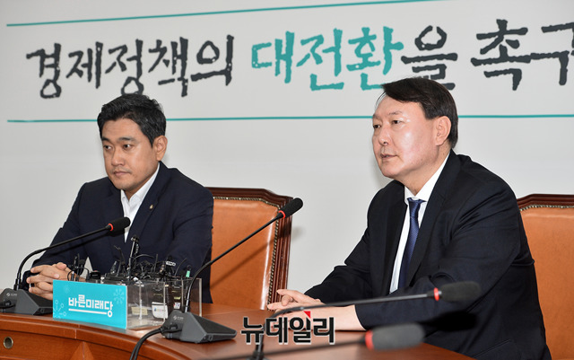 윤석열 신임 검찰 총장이 7일 오후 국회에서 오신환 바른미래당 원내대표를 예방해 인사말을 하고 있다.