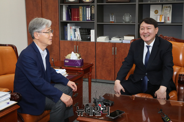 윤석열 검찰총장이 7일 오후 국회에서 여상규 법제사법위원회 위원장을 예방해 환담을 나누고 있다.