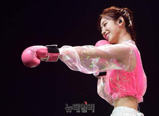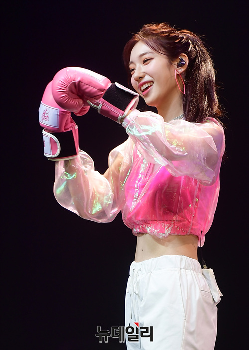 신인걸그룹 '로켓펀치(RORKET PUNCH)' 멤버 수윤이 7일 오후 서울 광진구 예스24라이브홀에서 열린 데뷔쇼케이스에서 글로브를 끼고 펀치 퍼포먼스를 선보이고 있다.