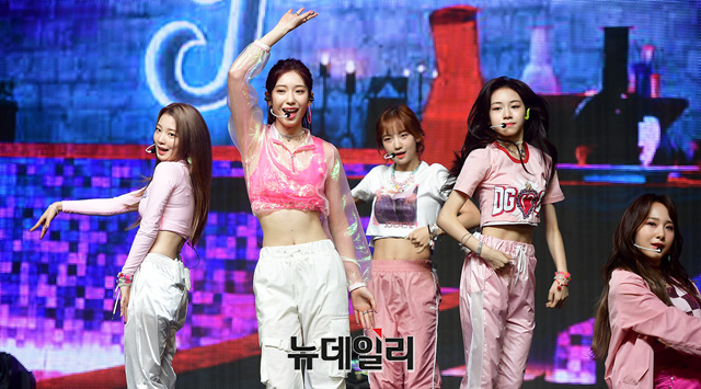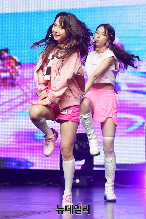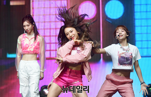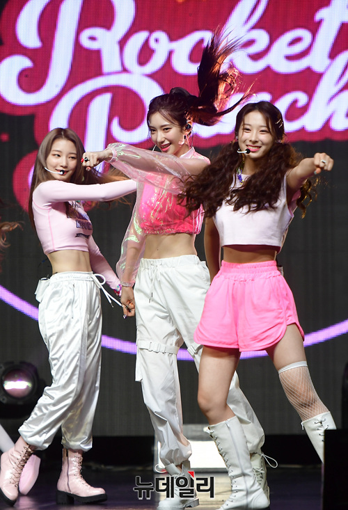 신인걸그룹 '로켓펀치(RORKET PUNCH)'가 7일 오후 서울 광진구 예스24라이브홀에서 열린 데뷔쇼케이스에서 타이틀곡 '빔밤붐' 무대를 선보이고 있다.