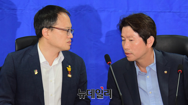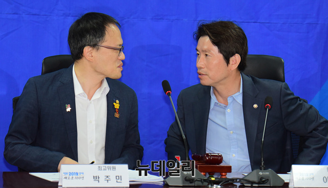 이인영 더불어민주당 원내대표가 9일 오전 국회 의원회관에서 열린 확대간부회의에 참석해 박주민 최고위원과 대화를 나누고 있다.