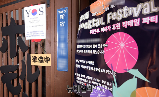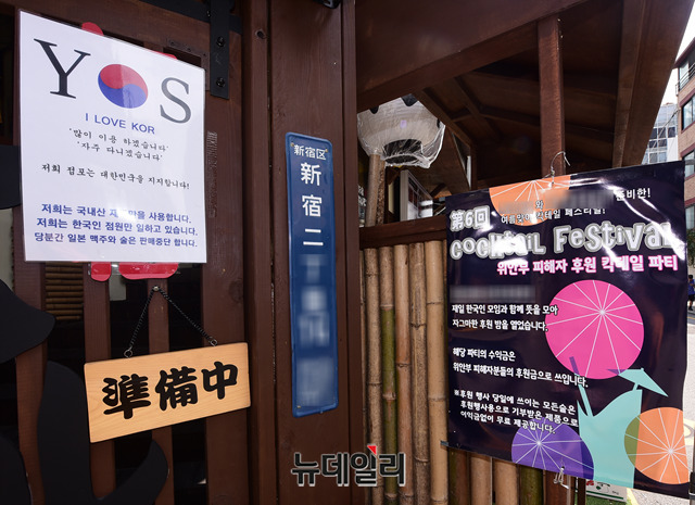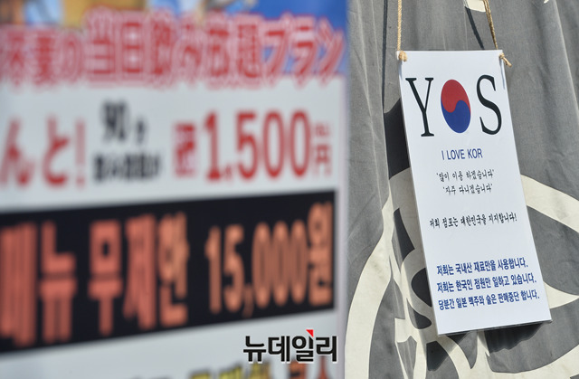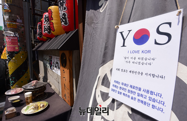 일본의 수출규제로 인해 일본산 제품 불매운동이 이어지는 9일 오후 서울 마포구에 위치한 일식집 가게에 '위안부 피해자 후원 칵테일 파티', '국내산 사용·한국인 점원 근무'라고 적힌 피켓이 걸려있다.