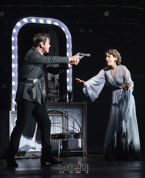 뮤지컬배우 테이(스톤 분), 리사(바비 분), 정준하(어윈어빙 분)가 9일 오후 서울 중구 충무아트센터에서 열린 뮤지컬 '시티오브엔젤' 프레스콜에서 하이라이트 장면을 시연하고 있다.'시티오브엔젤'은 꿈을 이루기 위해 할리우드에 입성한 신인 작가가 시나리오 작업을 하면서 벌어지는 에피소드와 작가가 만든 시나리오 속 탐정 스톤이 사건을 맡으면서 벌어지는 에피소드가 극중극으로 이야기가 전개되는 작품이다.8월 8일부터 10월 20일까지 충무아트센터 대극장에서 공연된다.