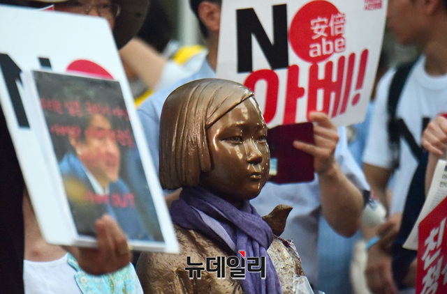 '아베규탄 4차 촛불 문화제'가 10일 오후 서울 종로구 옛 일본대사관 앞에서 열린 가운데 참석자들이 평화의 소년상 주변에서 친일파 규탄 구호를 외치고 있다.