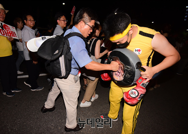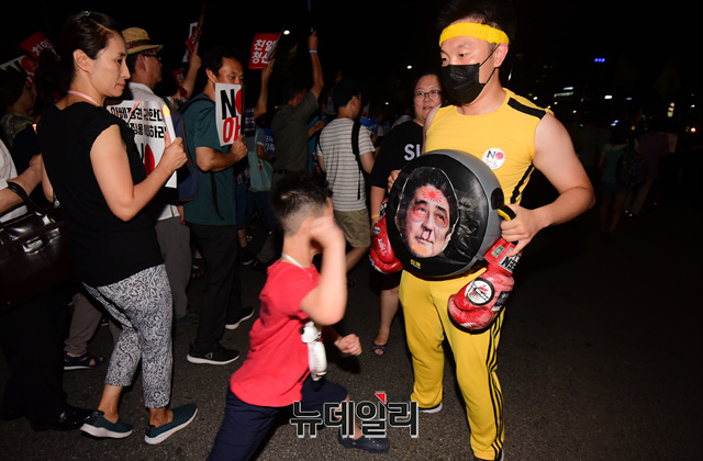 '아베규탄 4차 촛불 문화제' 참석자들이 10일 오후 서울 종로구 옛 일본대사관 앞에서 열린 집회를 마친 후 한 어린이가 일본 아베 총리가 그려진 샌드백을 치고 있다.