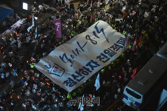'아베규탄 4차 촛불 문화제'가 10일 오후 서울 종로구 옛 일본대사관 앞에서 열린 가운데 참석자들이 광복절 집회를 알리는 현수막 펼치는 퍼포먼스를 하고 있다.