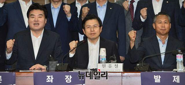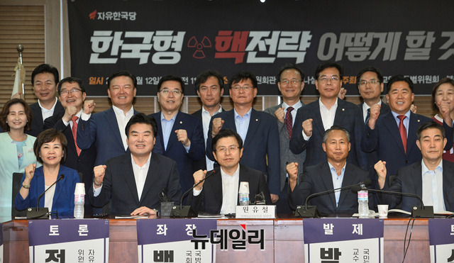 황교안 자유한국당 대표, 원유철 북핵외교안보특위 위원장 및 참석자들이 12일 오전 국회 의원회관에서 열린 '한국형 핵전략 어떻게 할 것인가' 정책토론회에서 기념촬영을 하고 있다.