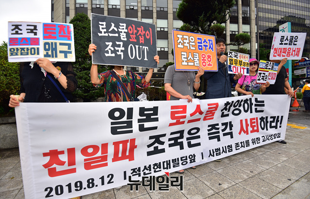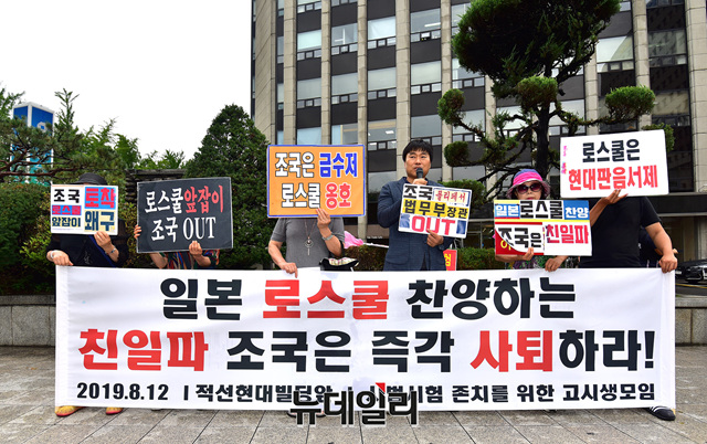 이종배 사법시험존치를위한고시생모임 대표와 회원들이 12일 오전 조국 법무부장관 내정자의 인사청문회 사무실이 차려진 서울 종로구 적선현대빌딩 앞에서 조 내정자의 장관 사퇴를 촉구하는 기자회견을 갖고 있다.