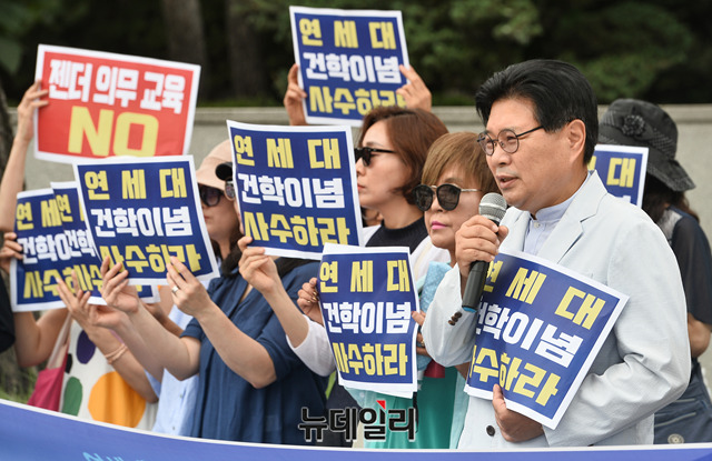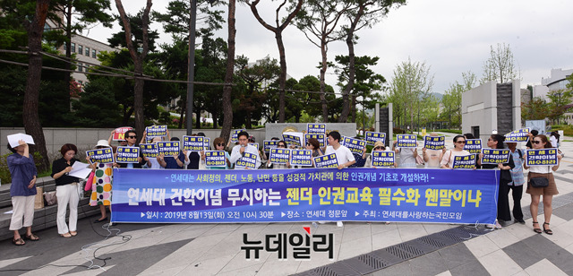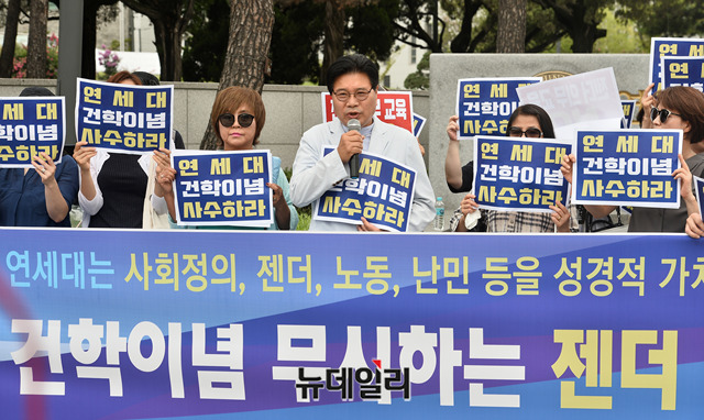 이날 열린 기자회견은 연세대의 건학이념을 무시하는 '인권과 연세정신'이라는 젠더 인권교육 필수과목을 지정취소를 요구하기 위해 열렸다.