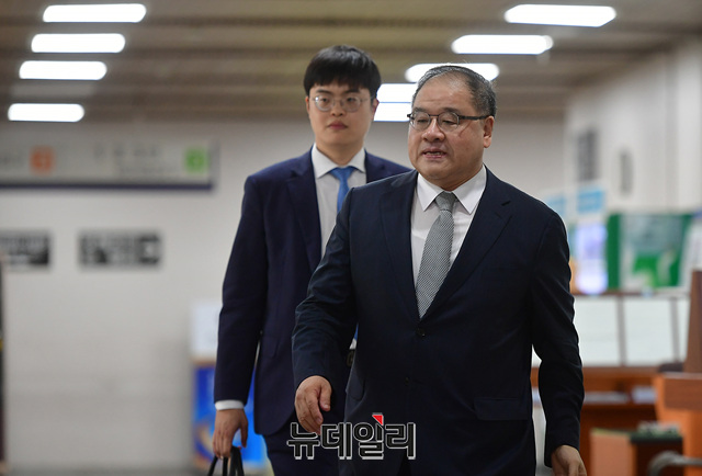 안종범 전 청와대 정책조정수석이 13일 오후 서울 서초구 서울고등법원에서 열린 삼성노조 와해 과련 재판에 입장하고 있다.