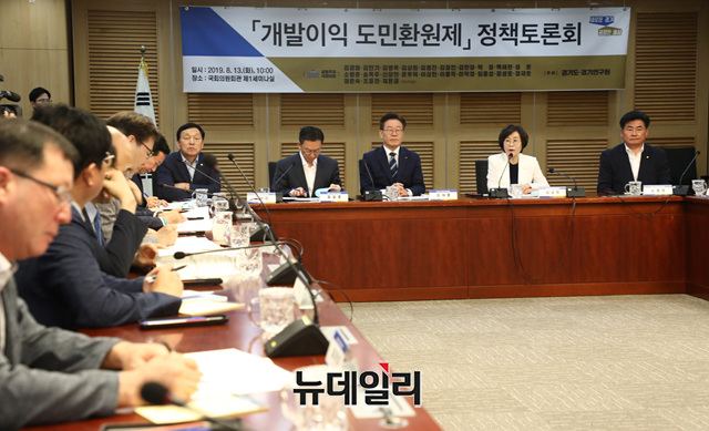 이재명 경기도지사가 13일 오전 국회 의원회관에서 열린 '개발이익 도민환원제 정책토론회'에 참석해 인사말을 하고 있다.