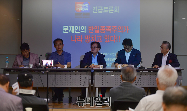 대한민국수호비상국민회의 등 우파단체가 13일 오후 서울 서초구 서울지방변호사회관에서 '문재인의 반일종족주의가 나라 망치고 있다'를 주제로 긴급 시국 토론회를 갖고 있다.