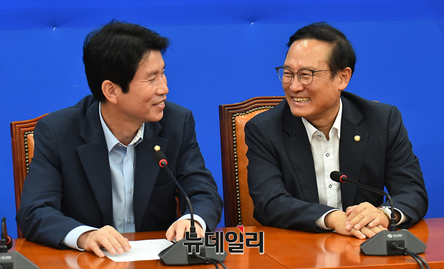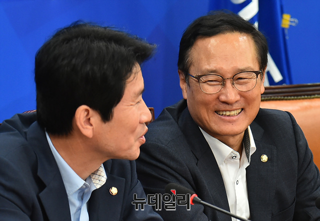 이인영 더불어민주당 원내대표와 홍영표 정치개혁특별위원회 위원장이 13일 오후 국회에서 패스트트랙 법안 관련 향후 전략을 논의하는 정개특위 및 사개특위 연석회의에 참석해 대화을 나누고 있다.