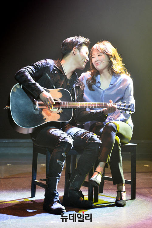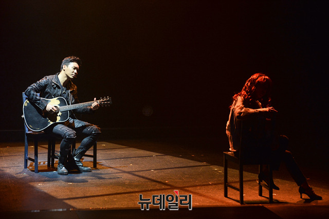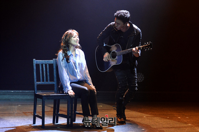 뮤지컬배우 이창희(테오 분), 최미소(헤이든 분)가13일 오후 서울 종로구 세종문화회관에서 열린 뮤지컬 '블루레인' 프레스콜에서 무대 시연을 하고 있다.