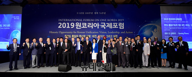 문현진 글로벌피스재단 의장, 김병준 전 자유한국당 비대위원장, 안호영 북한대학원대학교 총장 겸 전 주미대사, 휴야 왕 중국과세계화센터 창립자겸 회장, 윌리엄 파커 미 동서연구소 CEO 및 참석자들이 14일 오전 서울 중구 더플라자호텔에서 열린 '2019 원코리아국제포럼'에서 기념촬영을 하고 있다.기조연설에는 문현진 글로벌피스재단 의장이 맡았다. 특별연설에는 김병준 전 한국당 비대위원장, 안호영 북한대학원대학교 총장 겸 전 주미대사, 휴야 왕 중국과세계화센터 창립자 겸 회장, 윌리엄 파커 미 동서연구소 CEO가 나섰다.이번 국제포럼은 3.1운동 100주년을 맞이하는 광복절을 기념해 한반도 통일을 위한 근본적인 문제 해결의 길을 모색하고자 열렸다.