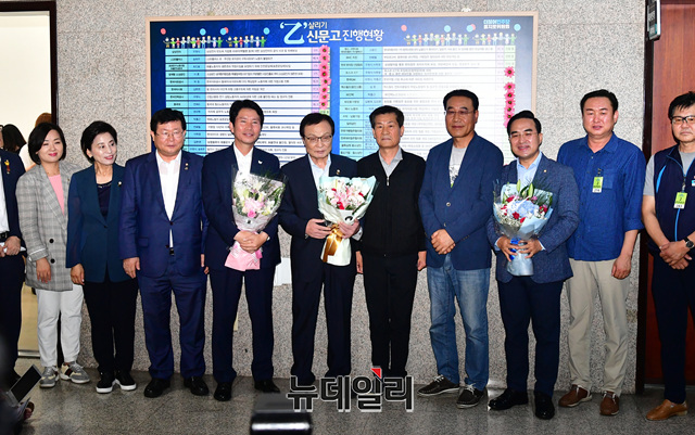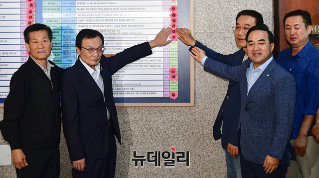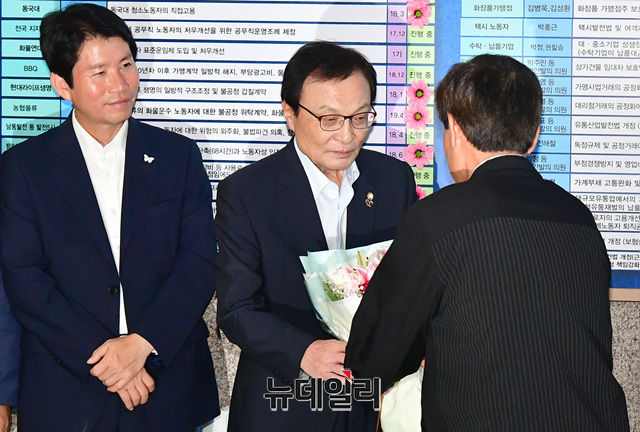 이해찬 더불어민주당 대표, 이인영 원내대표, 박홍근 을지로위원장 등이 14일 오전 국회에서 택시월급제 법안 통과 상생꽃달기 행사를 갖고 있다.