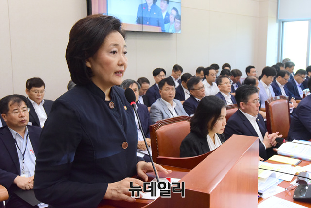 박영선 중소벤처기업부 장관이 13일 오전 국회에서 열린 산업통상자원중소벤처기업위원회 전체회의에 참석해 '일본 수출규제 강화조치 현황 및 대응방안' 관련 현안보고를 하고 있다.