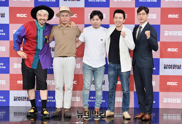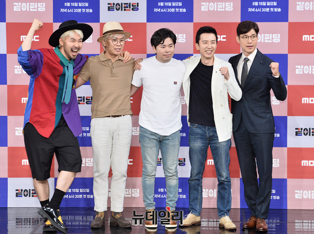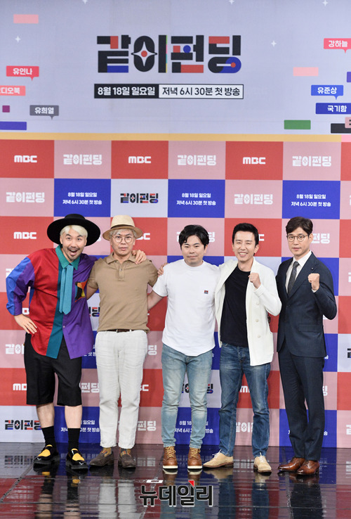 개그맨 노홍철(왼쪽부터), 감독 김태호, 현정완, 가수 유희열, 배우 유준상이 14일 오후 서울 마포구 MBC신사옥에서 열린 예능 '같이펀딩(연출 김태호, 현정완)' 제작발표회에서 포토타임을 갖고 있다.