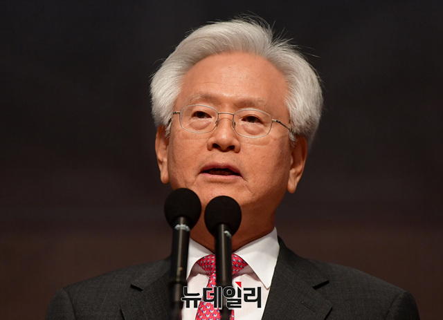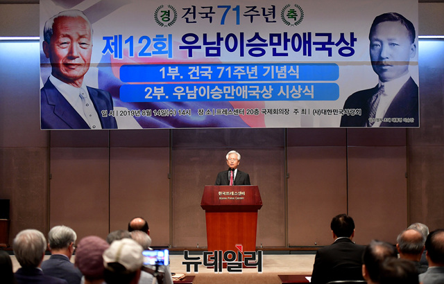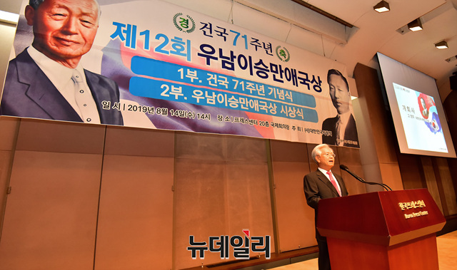 고영주 대한민국사랑회 이사장이 14일 오후 서울 중구 한국프레스센터에서 열린 제12회 우남이승만애국상 시상식에서 개회사를 하고 있다.