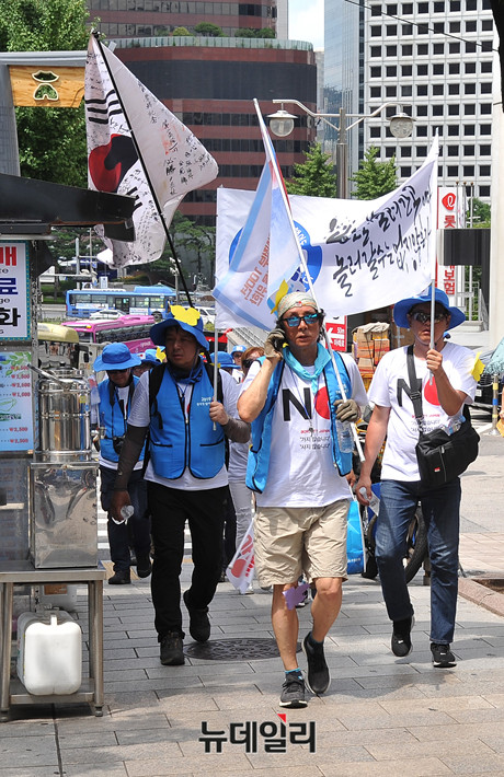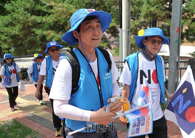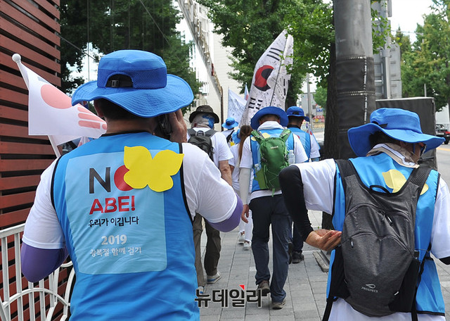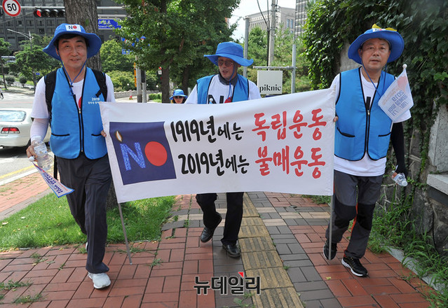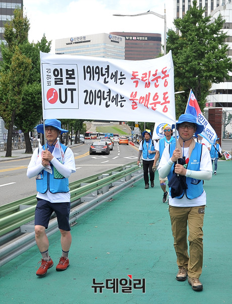 이종걸 더불어민주당 의원과 '2019 광복절 맞이 함께 걷기' 참가자들이 14일 오후 서울 중구 남대문시장 앞 소월로 일대에서 일본 불매운동이 적힌 현수막을 들고 행진하고 있다.'2019 광복절 맞이 함께 걷기'는 3.1운동·임시정부 100주년을 기념하고, 일본의 경제보복을 규탄하는 행사로 올해로 여섯번 째다.이들은 12일 오전 천안 독립기념관을 출발해 평택 수원 성남을 거쳐 14일 서울 남산 조선신궁터에서 일본군 위안부 피해자 기림의 날 기념식에 참석할 예정이다.