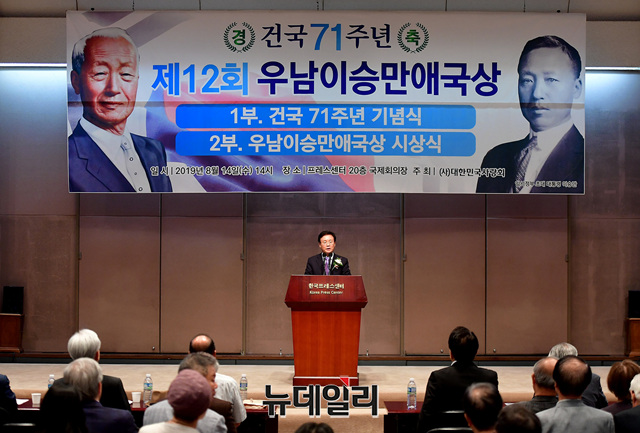 유동열 자유민주연구원장이 14일 오후 서울 중구 한국프레스센터에서 열린 제12회 우남이승만애국상 시상식에서 수상소감을 밝히고 있다.우남이승만애국상은 대한민국 건국 대통령인 우남 이승만 박사의 애국애족 정신을 기리고 뜻을 받들어 후대까지 계승 발전시키기 위한 목적으로 제정됐다.올해 우남이승만애국상 수상자는 △ 유동열 자유민주연구원 원장(대상) △ 이영환 전환기정의워킹그룹 대표(청년상), 김수현 新전국대학생대표자협의회 의장(청년상)이 각각 수상했다.