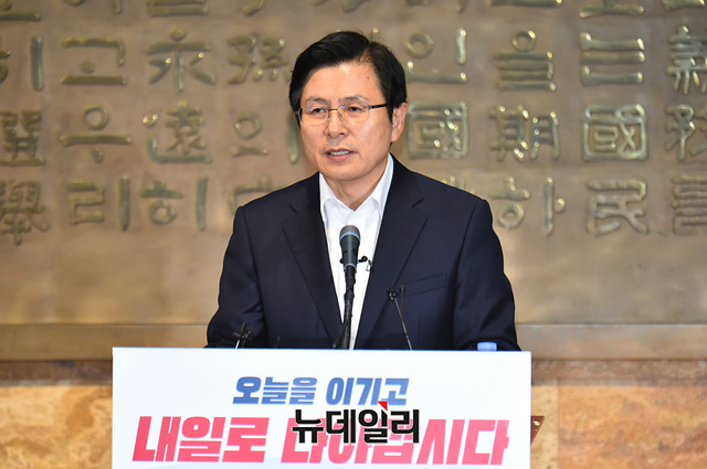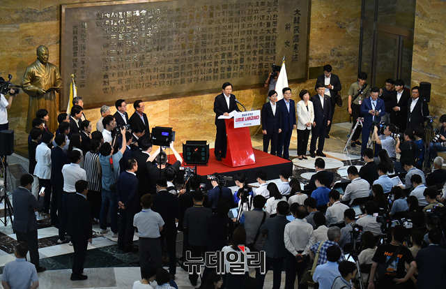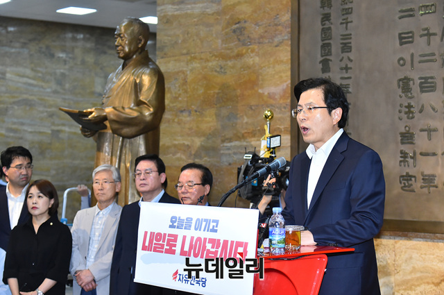 황교안 자유한국당 대표가 14일 오후 국회 로텐더홀에서 광복절 대국민 담화문을 발표하고 있다. 이하는 전문이다.