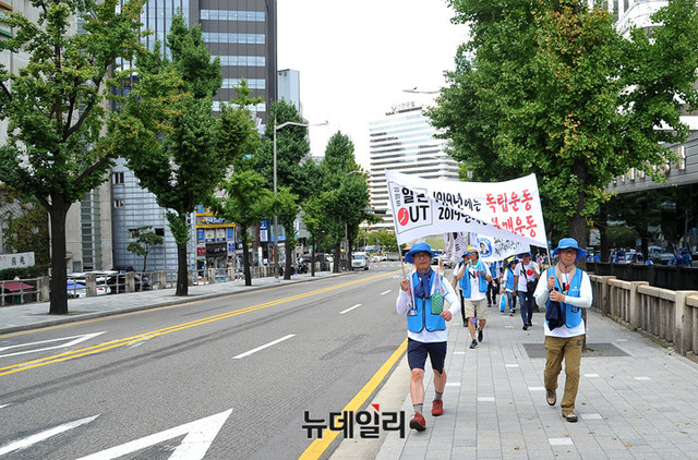 '2019 광복절 맞이 함께 걷기' 참가자들이 14일 오후 서울 중구 남대문시장 앞 소월로 일대에서 'NO ABE'가 적힌 옷을 입고 행진하고 있다.이들은 12일 오전 천안 독립기념관을 출발해 평택 수원 성남을 거쳐 14일 서울 남산 조선신궁터에서 일본군 위안부 피해자 기림의 날 기념식에 참석했다.