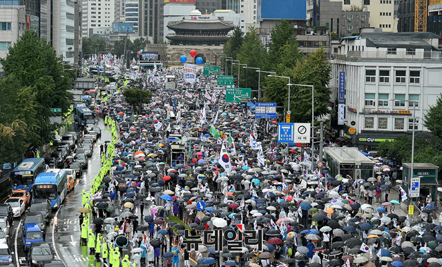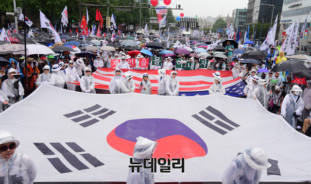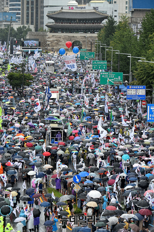 제74주년 광복절이자 제71주년 건국절인 15일 오후 서울 남대문 인근에서 열린 8.15 총궐기 태극기 집회에서 우리공화당원 및 우파시민단체 회원들이 "문재인 퇴진, 박근혜 대통령 복귀" 구호를 외치고 있다.