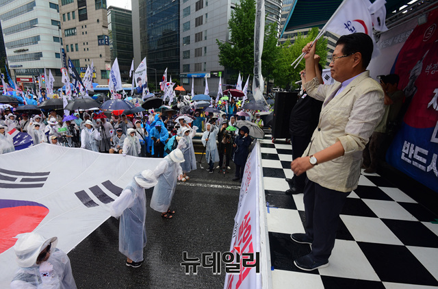 제 74주년 광복절, 제 71주년 건국절인 15일 오후 서울 남대문 인근에서 열린 8.15 총궐기 태극기 집회에서 조원진·홍문종 우리공화당 공동대표가 구호를 외치고 있다.