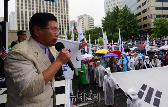 71주년 건국절인 15일 오후 서울 남대문 인근에서 열린 8.15 총궐기 국민대회에서 홍문종 우리공화당 공동대표가 연설을 하고 있다.