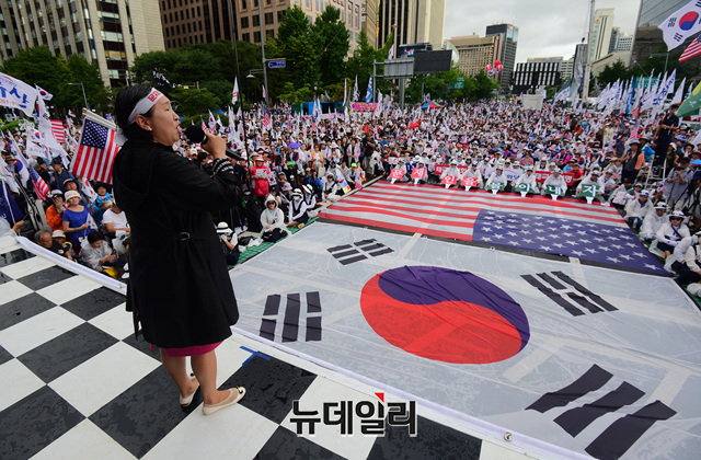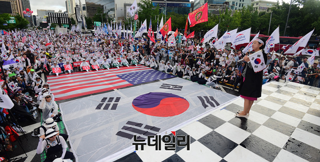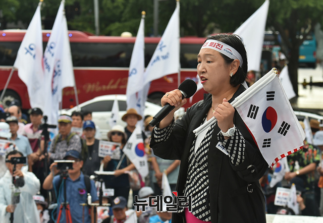 제 74주년 광복절, 제 71주년 건국절인 15일 오후 서울 중구 세종로에서 열린 연합 태극기 집회에 참석한 인지연 우리공화당 수석대변인이 연설을 하고 있다.
