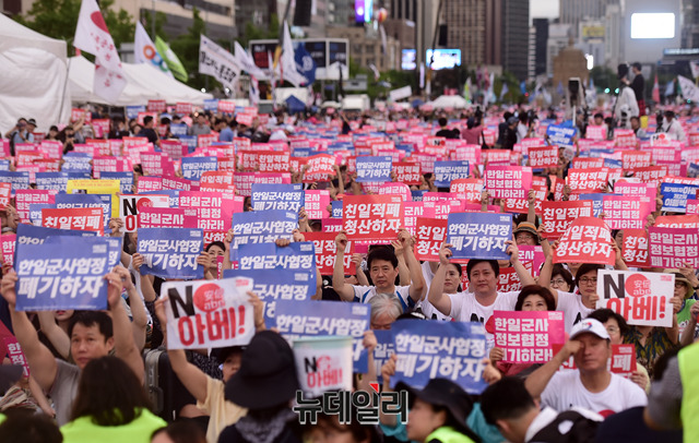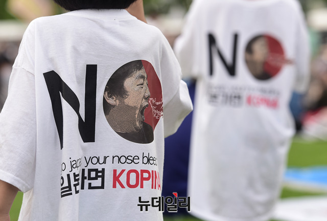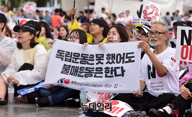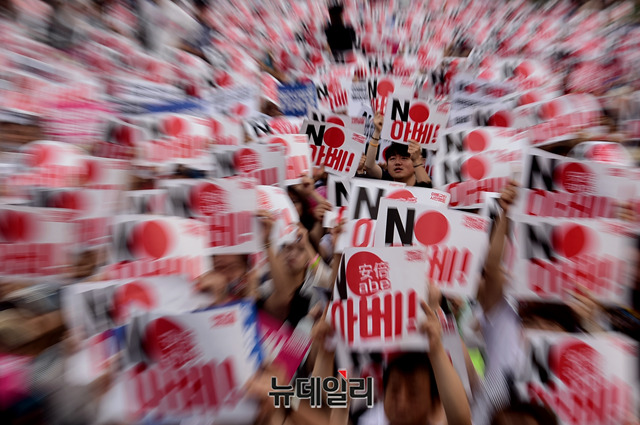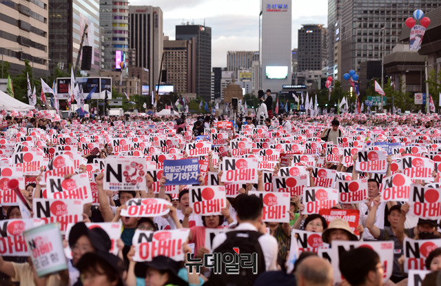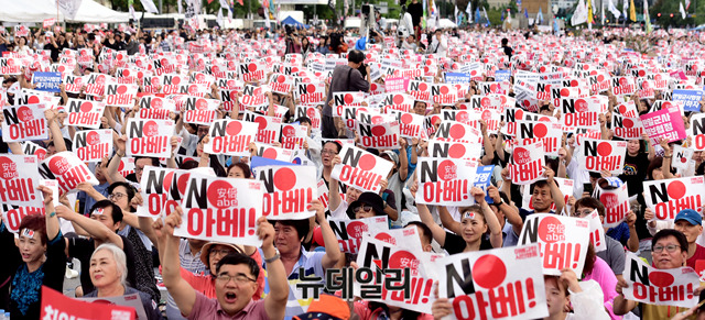 민노총, 한국진보연대 등 좌파단체로 구성된 '아베규탄시민행동'이 15일 오후 서울 광화문광장에서 열린 '아베 규탄 5차 촛불 집회'에서 피켓을 들고 구호를 외치고 있다. 이들은 아베 정권의 역사왜곡과 경제보복 조치를 규탄하고, 일본 제품 불매운동 동참을 호소했다.