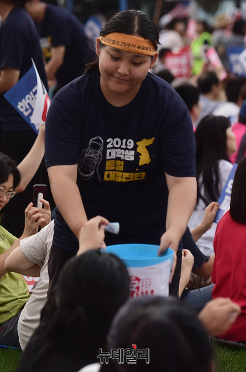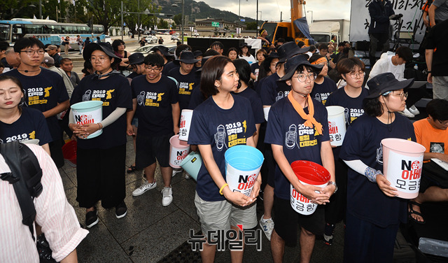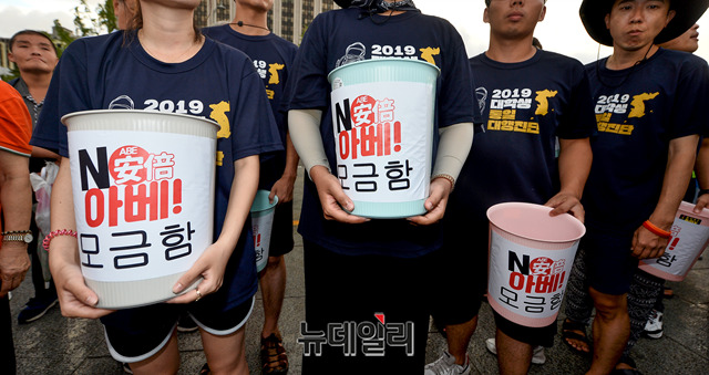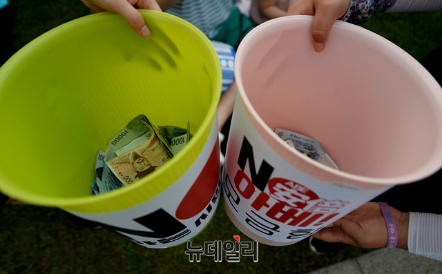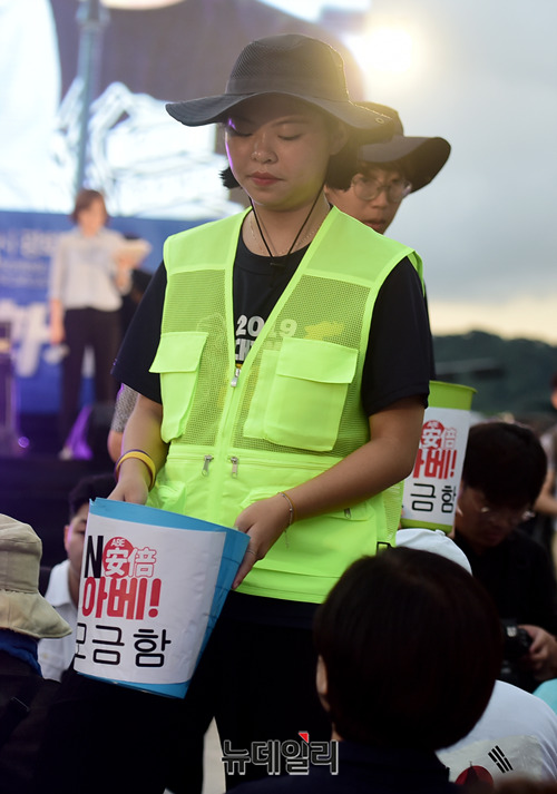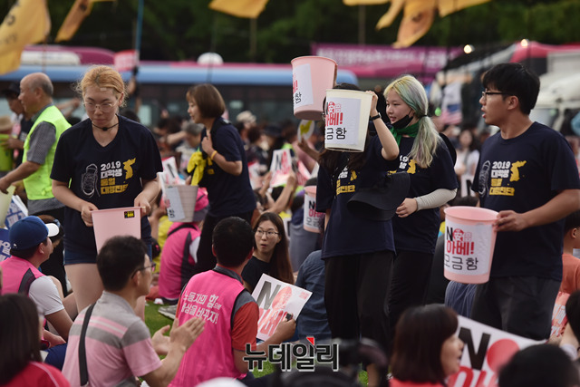 민노총, 한국진보연대 등 좌파단체로 구성된 '아베규탄시민행동'이 15일 오후 서울 광화문광장에서 열린 '아베 규탄 5차 촛불 집회'에서 모금을 하고 있다. 이들은 아베 정권의 역사왜곡과 경제보복 조치를 규탄하고, 일본 제품 불매운동 동참을 호소했다.