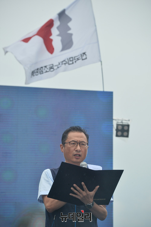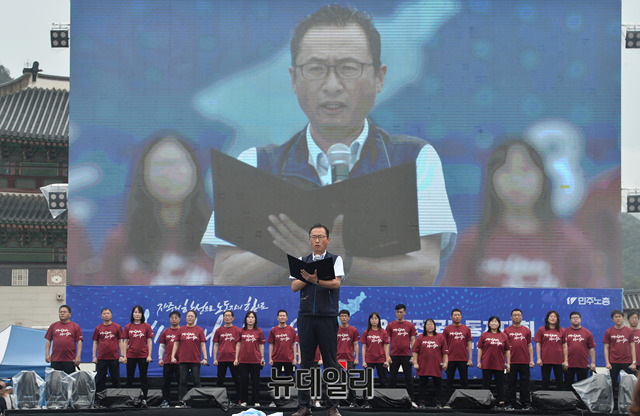 김명환 민노총 위원장이 15일 오후 서울 광화문 북측광장에서 열린 '8·15 전국 노동자대회'에서 대회사를 하고 있다.
