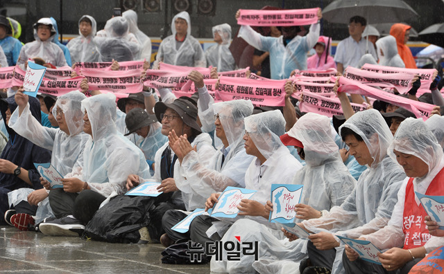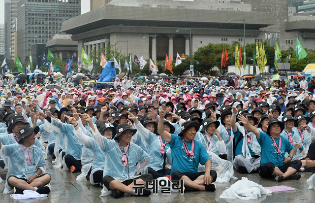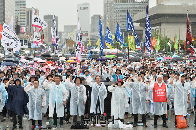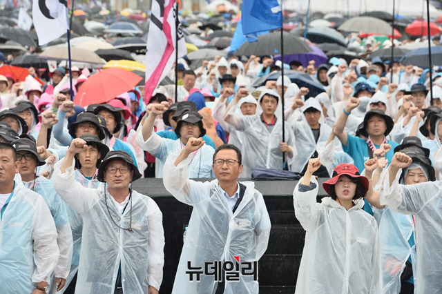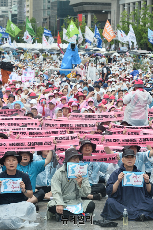 민노총이 15일 오후 서울 광화문 북측광장에서 열린 '8·15 전국 노동자대회'에서 피켓을 들고 구호를 외치고 있다. 이들은 8·15 전국 노동자대회가 끝난 후 '8.15 민족통일대회'와 '아베 규탄 5차 촛불 집회'에 합류했다.