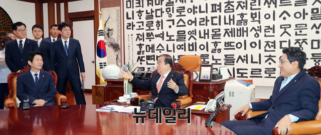 문희상 국회의장과 여야 원내대표가 19일 오전 국회 의장실에서 3당 교섭단체 원내대표 회동을 갖고 있다. 이날 나경원 자유한국당 원내대표는 회동에 불참했다. (왼쪽부터 이인영 더불어민주당, 문 의장, 오신환 바른미래당)