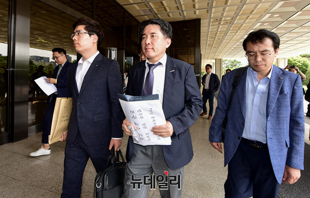 주익종, 김낙년, 김용삼, 주익종, 정안기, 이우연 등 '반일 종족주의' 필자 6명이 20일 오전 서울 서초구 서울중앙지방검찰청 앞에서 조국 법무부 장관 후보자 모욕죄 고소와 관련해 기자회견을 갖고 고소장을 제출하기 위해 이동하고 있다.조 후보자는 지난 5일 자신의 SNS에 베스트셀러 '반일 종족주의'를 놓고 "구역질 난다" 등의 비방을 하고, 필자들을 '부역 매국 친일파'로 매도한 바 있다.