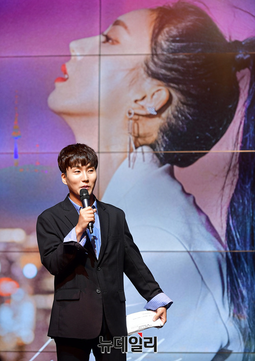 MC훈(김경훈)이 20일 오후 서울 강남구 슈피겐홀에서 열린 가수 소영의 첫 번째 싱글앨범 '숨(Breath)' 쇼케이스에서 인사말을 하고 있다.