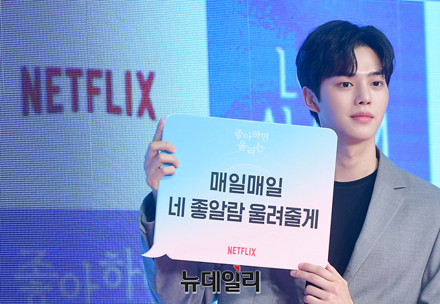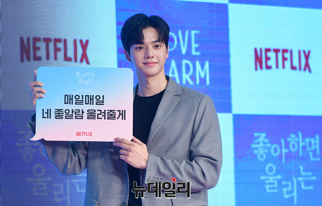 배우 송강이 20일 오전 서울 종로구 JW메리어트 동대문에서 열린 넷플릭스 오리지널 시리즈 '좋아하면 울리는(감독 이나정)' 제작보고회에서 포토타임을 갖고 있다.
