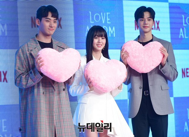 배우 정가람(왼쪽부터), 김소현, 송강이 20일 오전 서울 종로구 JW메리어트 동대문에서 열린 넷플릭스 오리지널 시리즈 '좋아하면 울리는(감독 이나정)' 제작보고회에서 포토타임을 갖고 있다.'좋아하면 울리는'은 좋아하는 사람이 반경 10m 안에 들어오면 알람이 울리는 '좋알람' 어플이 개발되면서 알람을 통해서만 마음을 표현할 수 있다는 여겨지는 세상에서 펼쳐지는 세 남녀의 로맨스를 그렸다.만화가 천계영의 동명의 원작 '좋아하면 울리는'을 원작으로 했다. 22일 공개.