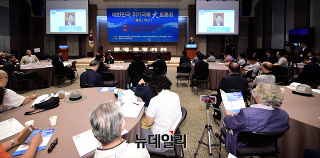 오세훈 전 서울시장이 20일 오후 서울 중구 프레스센터에서 열린 '대한민국 위기극복 대토론회'에서 모두발언을 하고 있다.